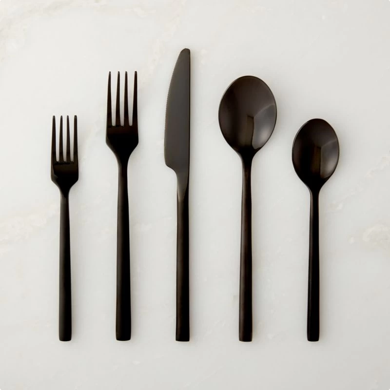 Sleek and balanced, flatware is forged with substantial heft in 18/0 stainless steel (13/0 for the knife). Brushed black finish. Five-piece setting serves a party of four. CB2 exclusive.
