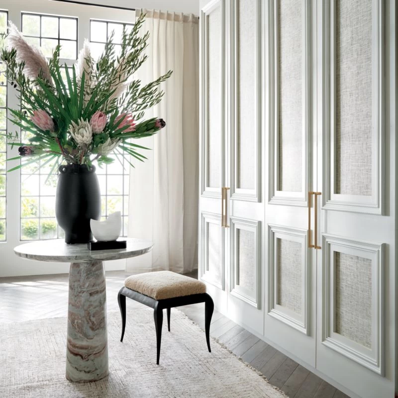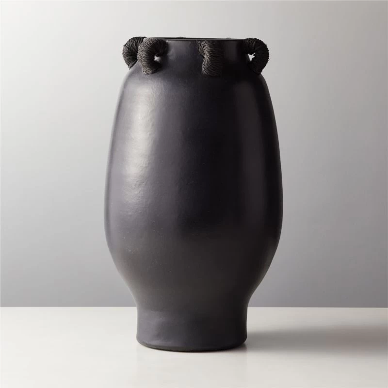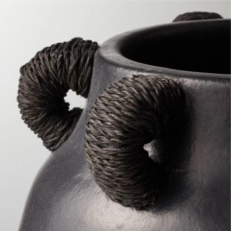 Museum-worthy vase is stunningly sculptural with an oversized hand-thrown shape and a cold matte black glaze to finish things off. Handles are wrapped in naturally dyed raffia to add a pop of unexpected texture to your arrangement. CB2 exclusive.