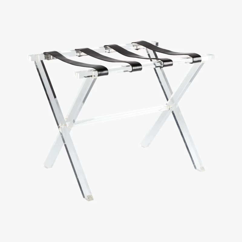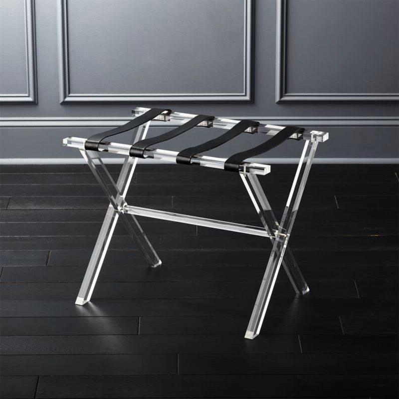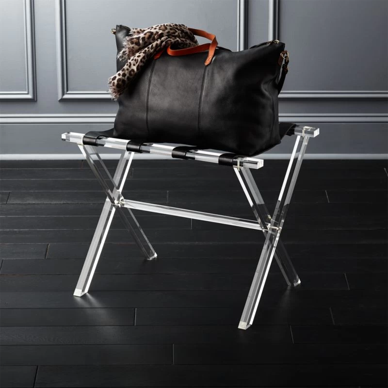 Transparent acrylic luggage rack floats luggage atop leather straps. Shows its hospitable side without taking up visual space in the guest room. Brass hardware adds fine finish. CB2 exclusive.