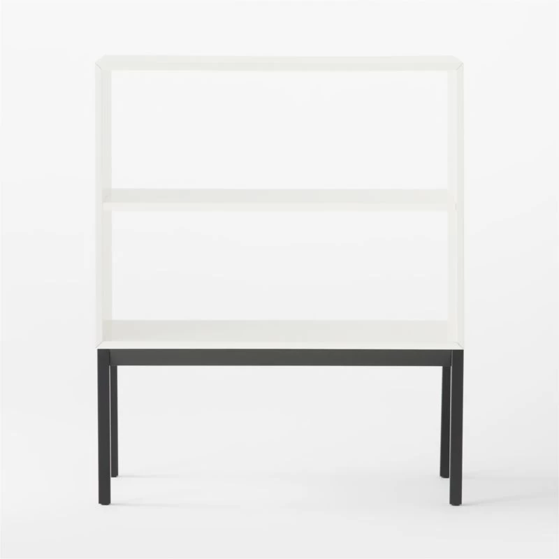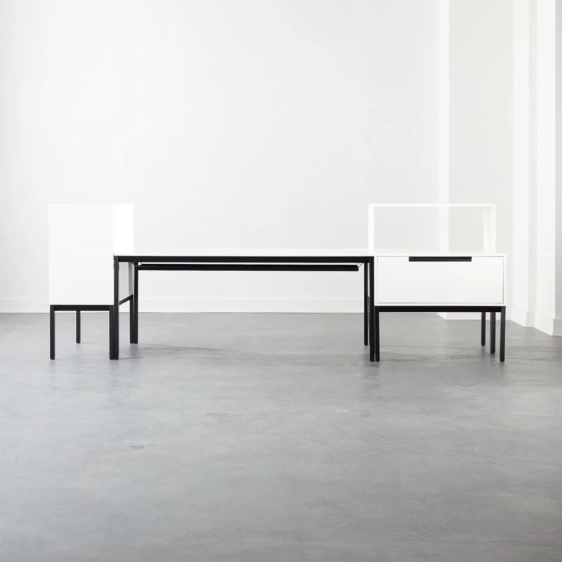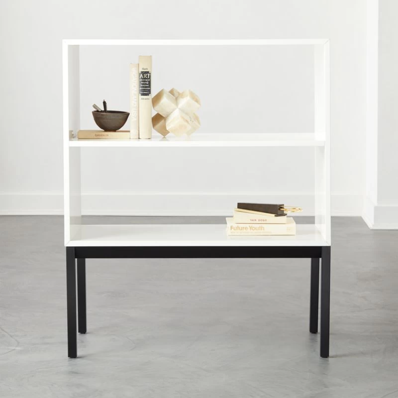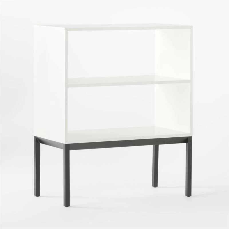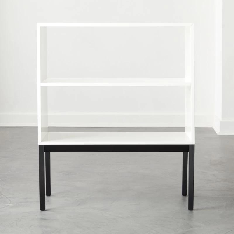 High-gloss lacquered white wood and black iron tubing create a streamlined workspace that can scale up or down to suit your space. Minimal bookshelf can live alone or layered with the Aptum Modular desk, file cabinet and two-drawer cabinet, depending on your needs. This chic modular system works in a variety of configurations and is completely customizable to fit almost any size space. CB2 exclusive.