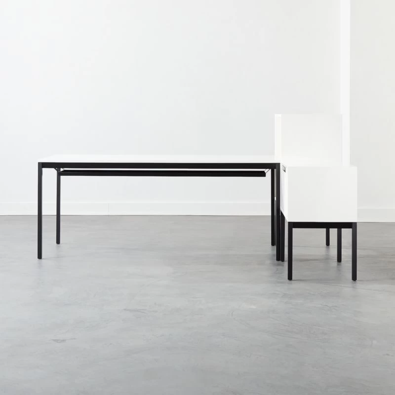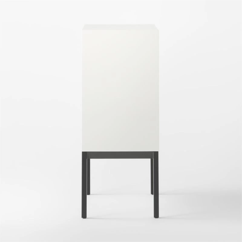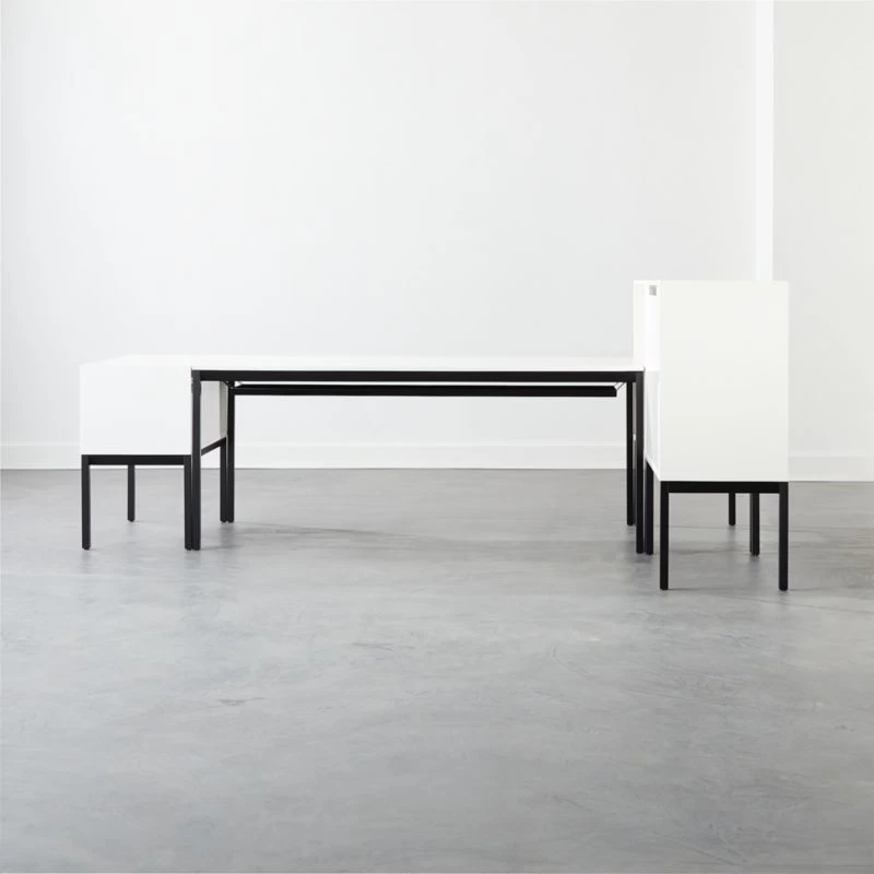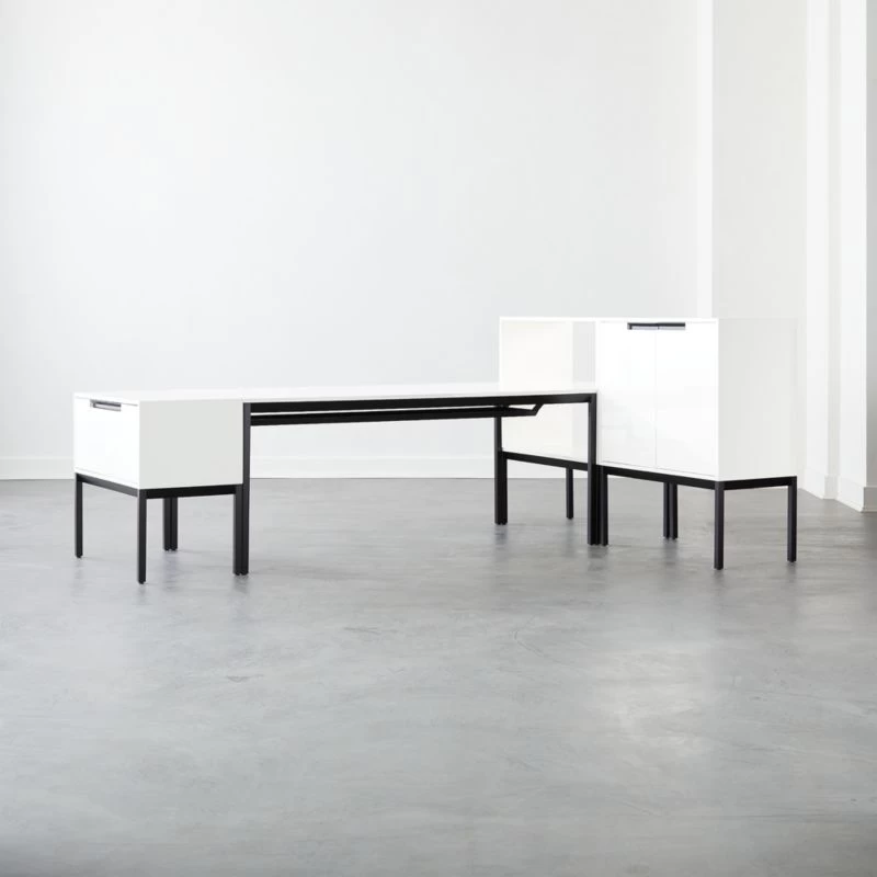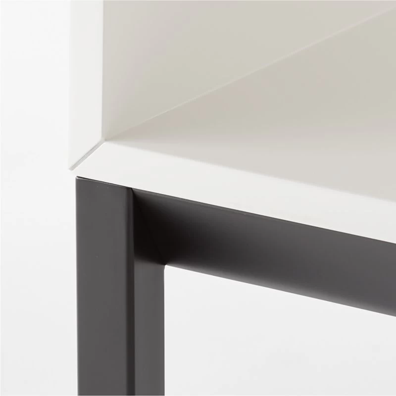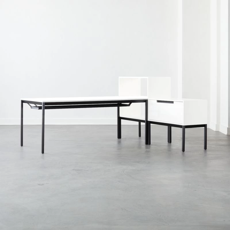 High-gloss lacquered white wood and black iron tubing create a streamlined workspace that can scale up or down to suit your space. Minimal bookshelf can live alone or layered with the Aptum Modular desk, file cabinet and two-drawer cabinet, depending on your needs. This chic modular system works in a variety of configurations and is completely customizable to fit almost any size space. CB2 exclusive.