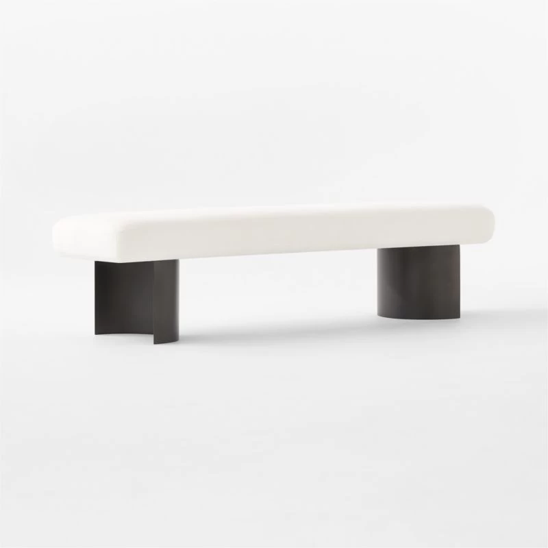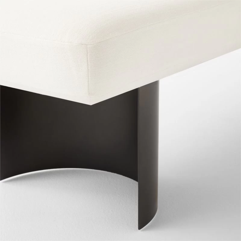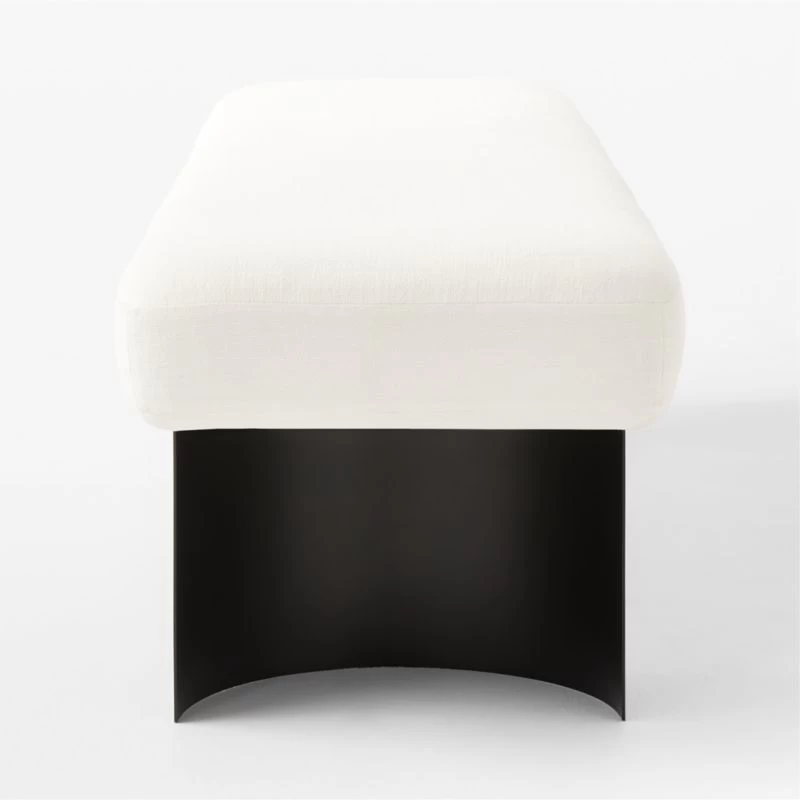 Upholstered bench from Melbourne-based design studio VUUE is distinguished by a refined, minimalist silhouette. Dark steel legs are molded into an unexpected demi-lune shape as a counterpoint to the plush linen seat. Sized perfectly for the entryway, living room or end of the bed. CB2 exclusive.