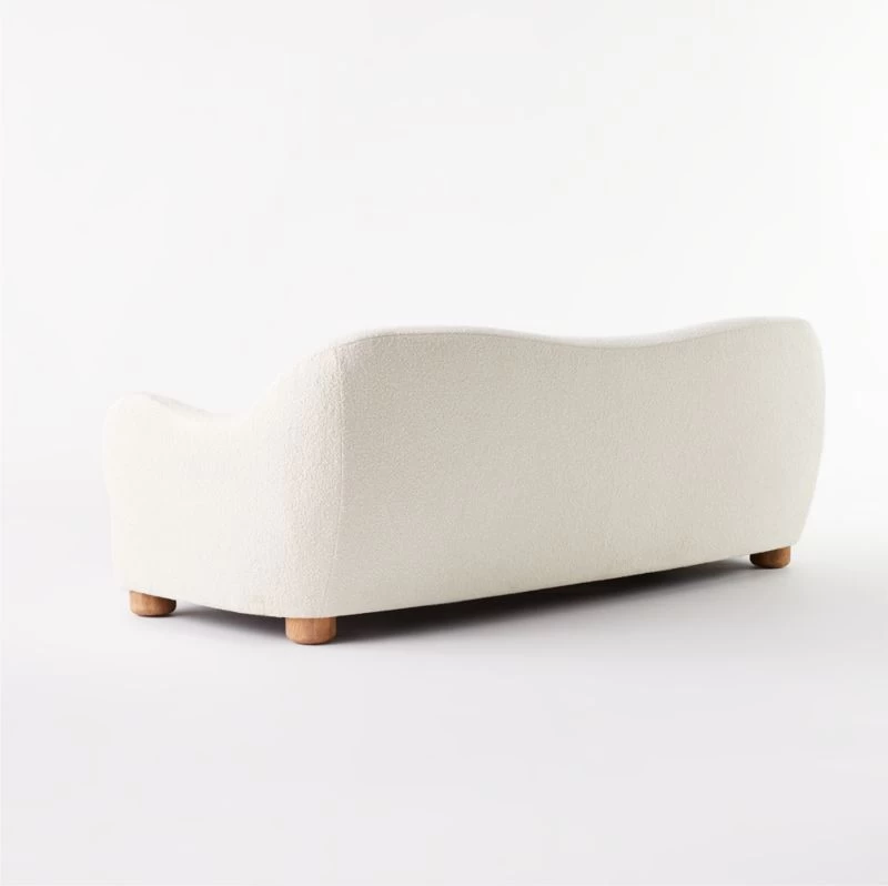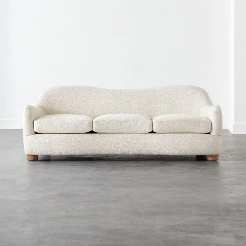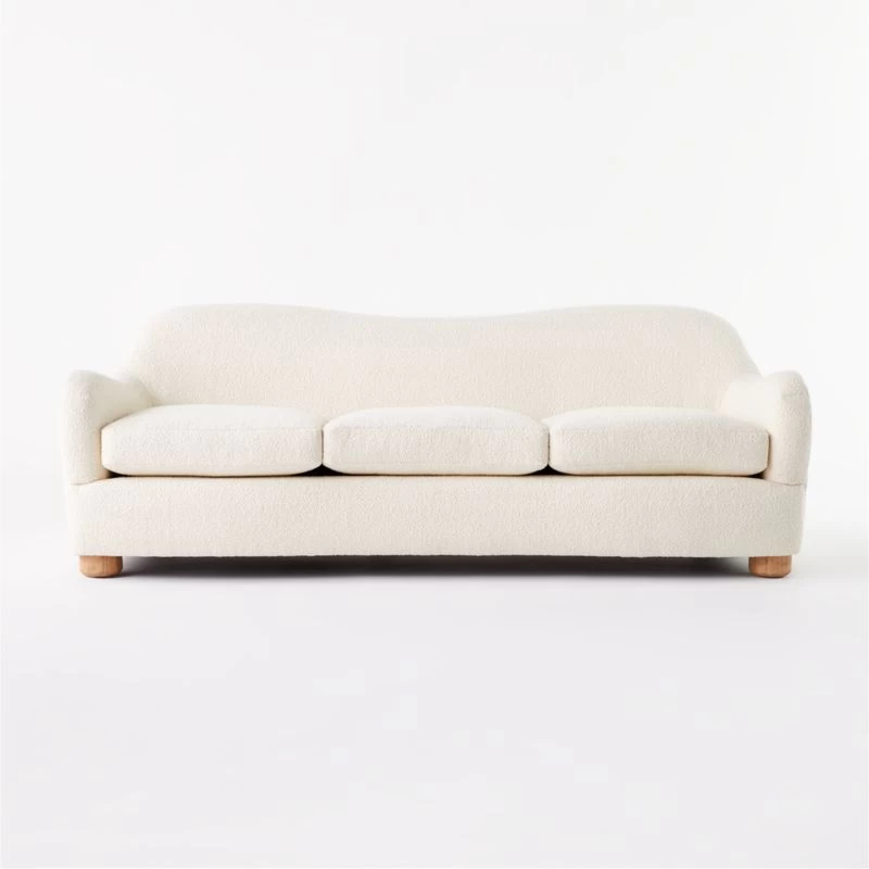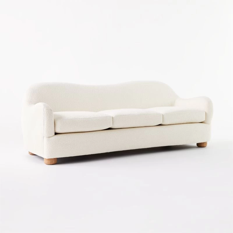 Boucle takes on cream-colored hues in loungeable sofa designed by Ross Cassidy. Bubbly in shape with rounded legs of solid bleached oak and an oversized silhouette made for spreading out. CB2 exclusive.