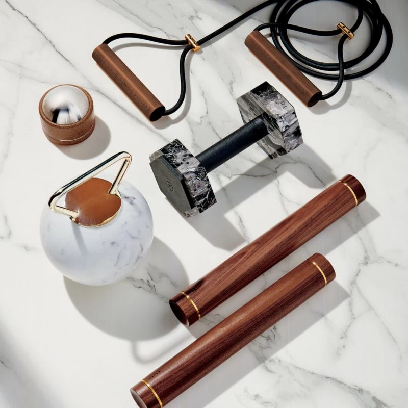 The dynamic variations of steely greys in Silver Dragon marble add modern movement to the fixed-weight 5-pound dumbbell. Connected by a smooth-handled iron rod that is powdercoated black, the hexagonal ends allow the weight to stand or sit flat. Which means when the workout is complete, the dumbbell does double-duty as a decorative object, doorstop or bookend. Sold individually. CB2 exclusive.