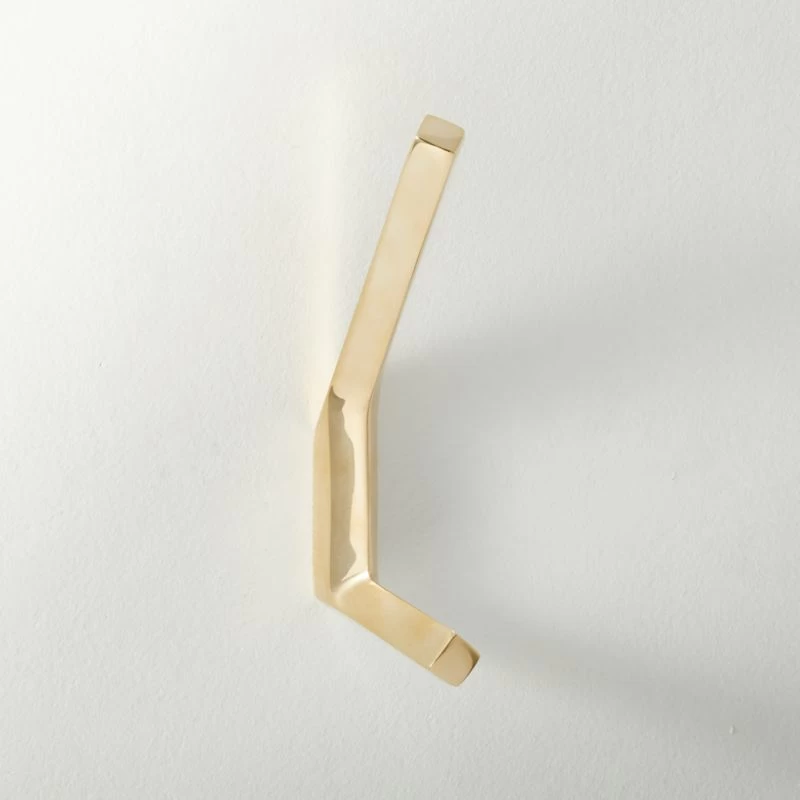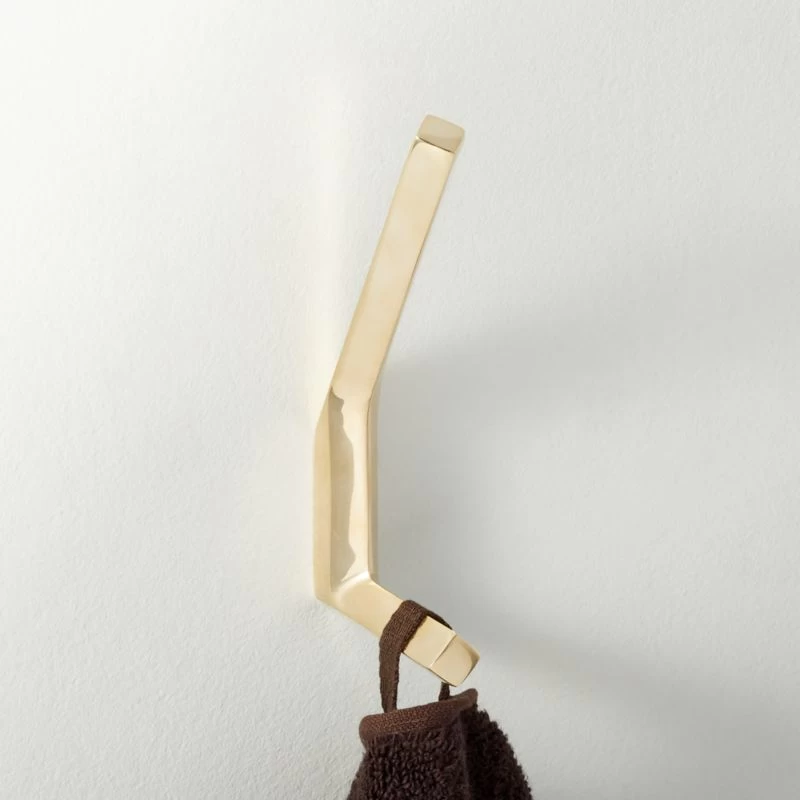 Designed by Barcelona-based Mermelada Estudio, unique beveled wall-mounted hook brings sharp lines and a touch of modern luxury to the bath. Solid brass is unlacquered for a living finish that will patina beautifully over time. Bathroom collection also includes towel ring, towel bar and toilet paper holder. CB2 exclusive.