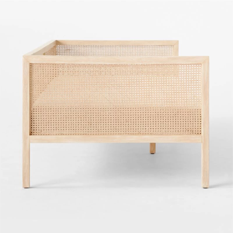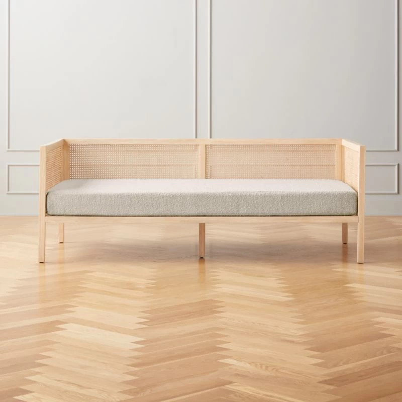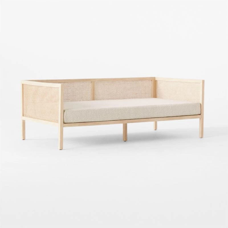 Designed by Mermelada Estudio in Spain, boho daybed approaches sofa styling with the comfort of a bed. Inspired by the Spanish tradition of siestas, subtly white washed rubberwood frames airy panels of handwoven rattan for a fresh, contemporary piece. Complete the look with a mix of pillows. Includes fibercore daybed mattress/trundle with luxe ivory boucle mattress cover. CB2 exclusive.