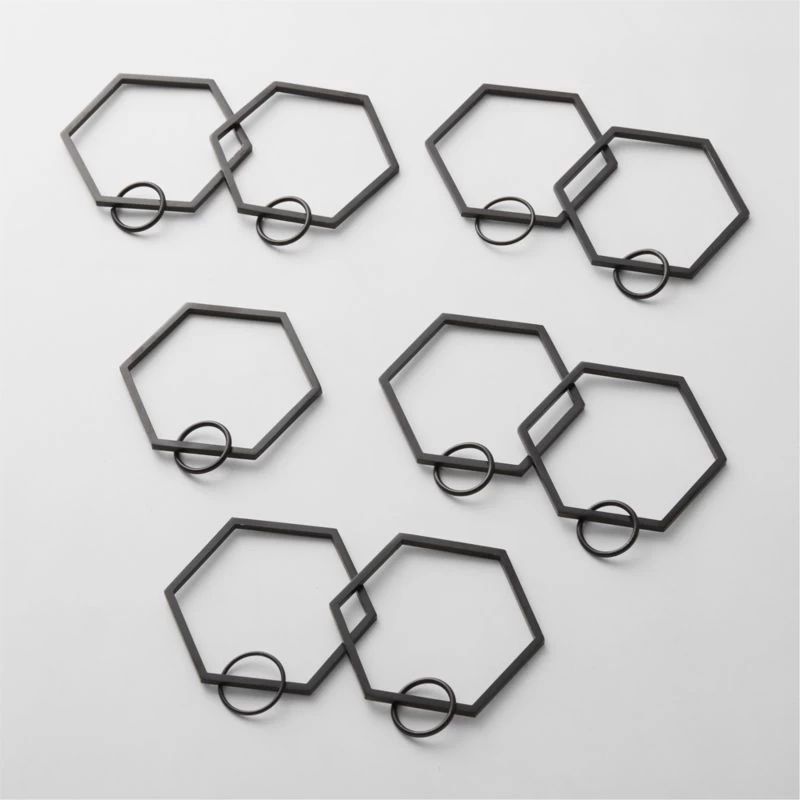 Set of nine matte black drapery rings hang curtains in geometric form. An edgy complement to the Bolt curtain collection designed by Sasha Adler.