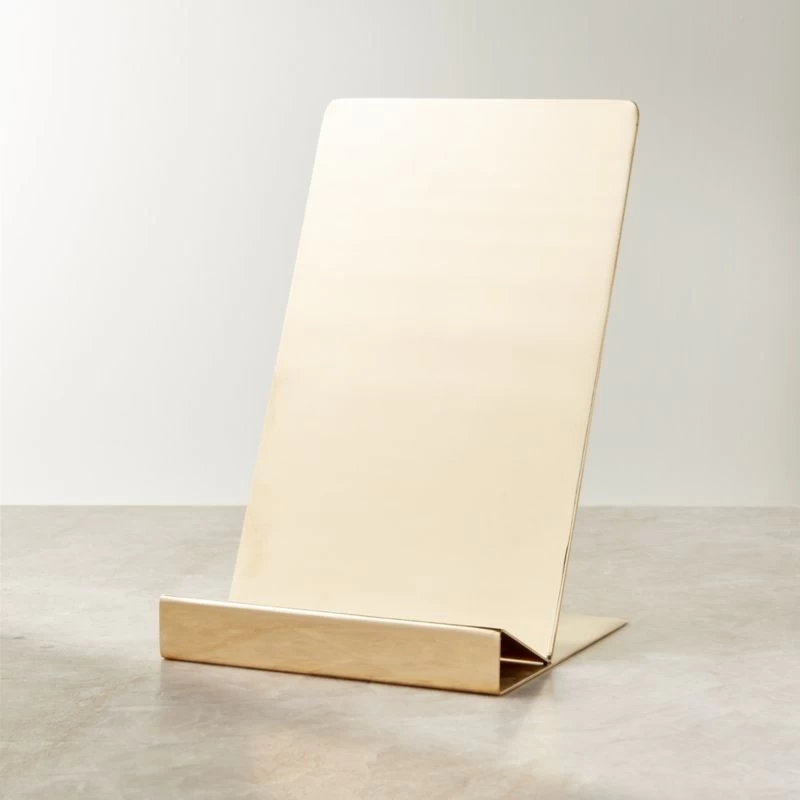 Book stand features polished unlacquered brass that will patina beautifully over time. Pair with a gorgeous coffee table book, tablet or cookbook for a thoughtful housewarming or wedding gift. CB2 exclusive.