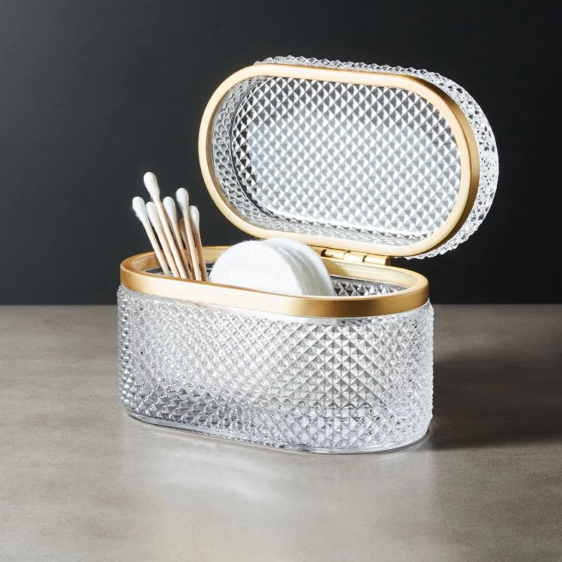 Crafted with substantial heft in clear glass and brass accents, this prismatic jewelry holder is embossed with a multifaceted texture that reflects light and retro glamour. Holds spare change, jewelry, q-tips, cotton balls, office supplies, business cards… the options are limitless. CB2 exclusive.