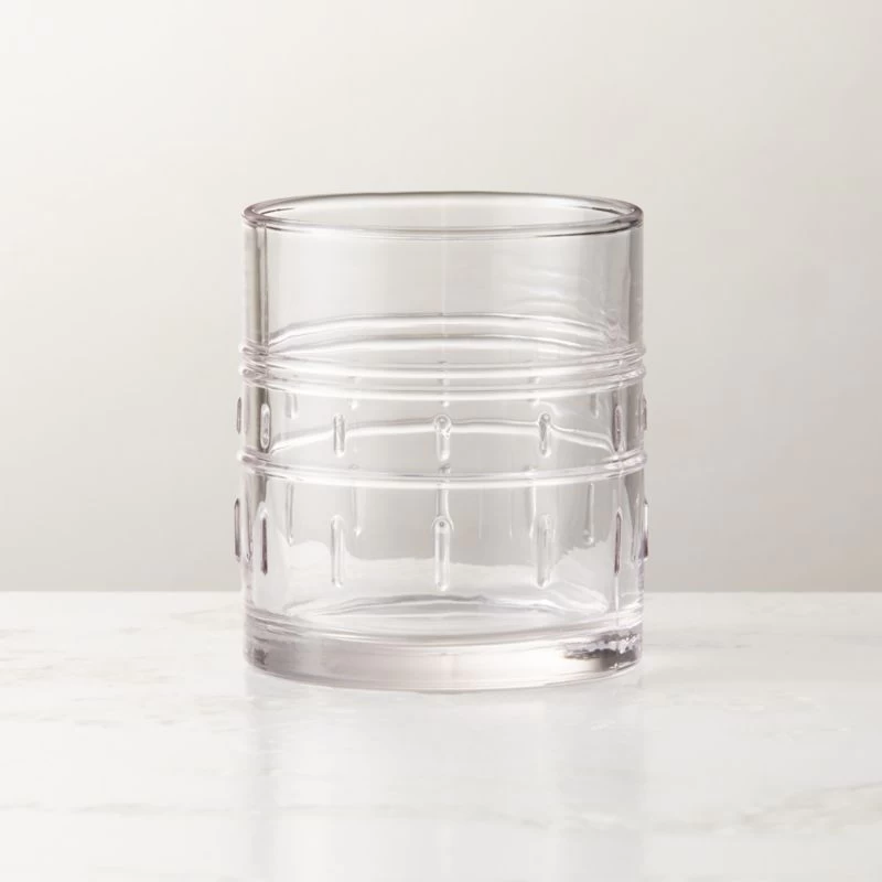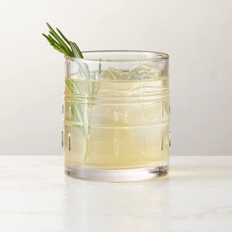 Clear double old-fashioned glass by Jean-Marc Bullet of ATELIER BULLET features an original design pressed with horizontal banding and short vertical lines. Bullet named this piece in honor of the Bushi-Nenge people, descendants of enslaved African people who escaped colonial plantations and formed independent communities in the rainforests of South America. CB2 exclusive.