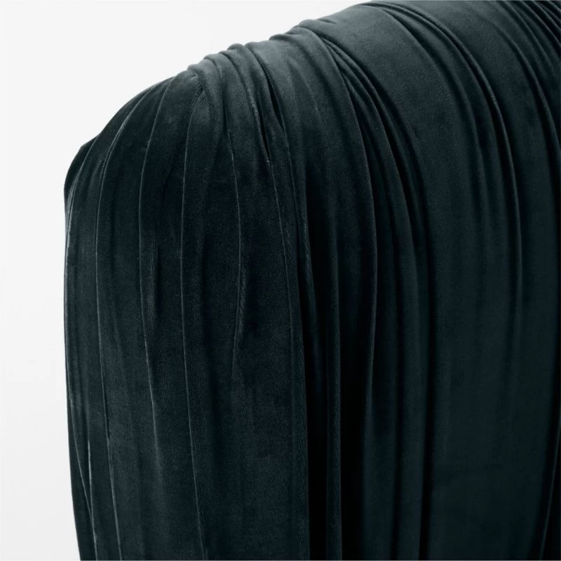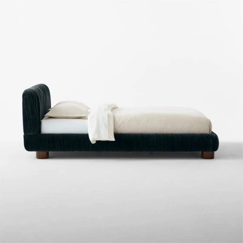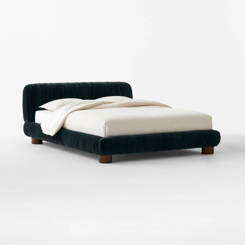 Fully upholstered bed by Jannis Ellenberger brings luxury and drama to the bedroom. Padded headboard, footboard and rails are enveloped in ruched blue velvet; stout cylindrical legs, crafted from oak certified sustainable by the Forest Stewardship Council ® (FSC), keep the look modern. CB2 exclusive.