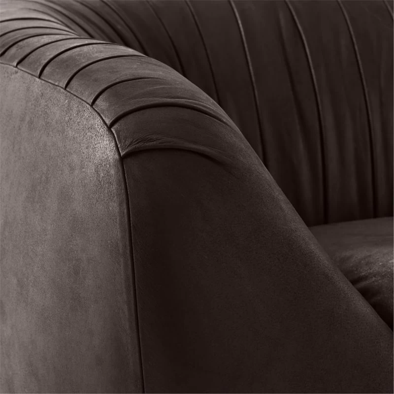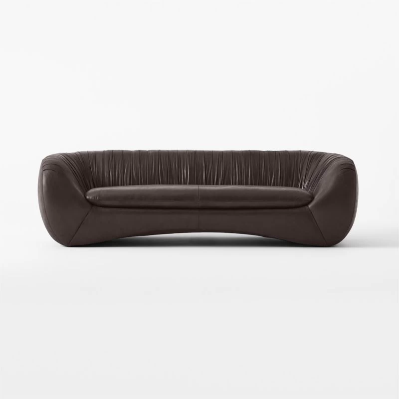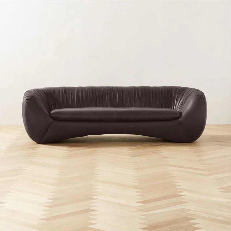 Cut with exaggerated curves, designer Nicholas Obeid’s sofa has a daring silhouette. Generously proportioned back and sides provide a comfortable place to lounge, while dramatic pleating and ruched details look chic in black Moore & Giles leather upholstery. CB2 exclusive.