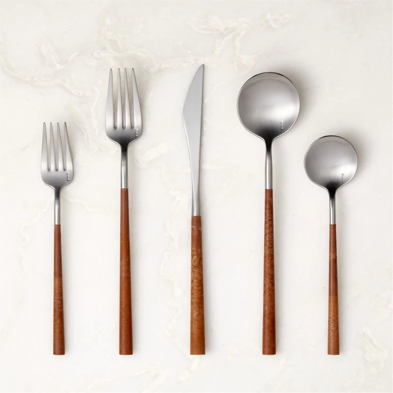 Handmade lightweight resin handles resemble wood in one of our most covetable flatware designs yet. Strikingly beautiful but practical enough for everyday use with a brushed stainless steel head. Includes one salad fork, one dinner fork, one knife, one teaspoon and one tablespoon. CB2 exclusive.