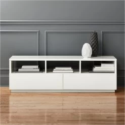 Thoughtful details and workmanship by Eric Pfeiffer at an exceptionally thoughtful CB2 price (of course). Three open component cubbies span over two XL closed drawers angled to open sans pulls on smooth metal glides. Smart details you can’t see here: back is completely finished—all white, all around—so it can float in the room; center media cutouts funnel cords to an integrated ledge along the entire lower back edge then out the bottom to tidy up wires. Engineered wood slicked in hi-gloss lacquer. chill media console is a CB2 exclusive.