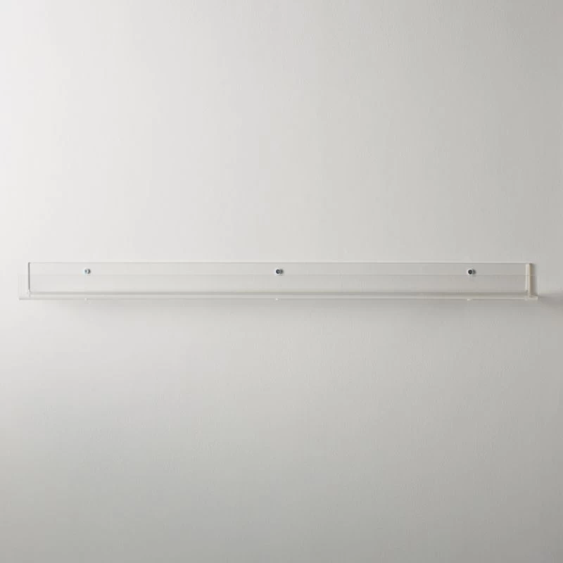 Handmade clear modern ledge with upturned edges suspend photos, artwork and objects with total transparency. We love them staggered in the hall or greeting guests at the entry. acrylic wall shelves is a CB2 exclusive.