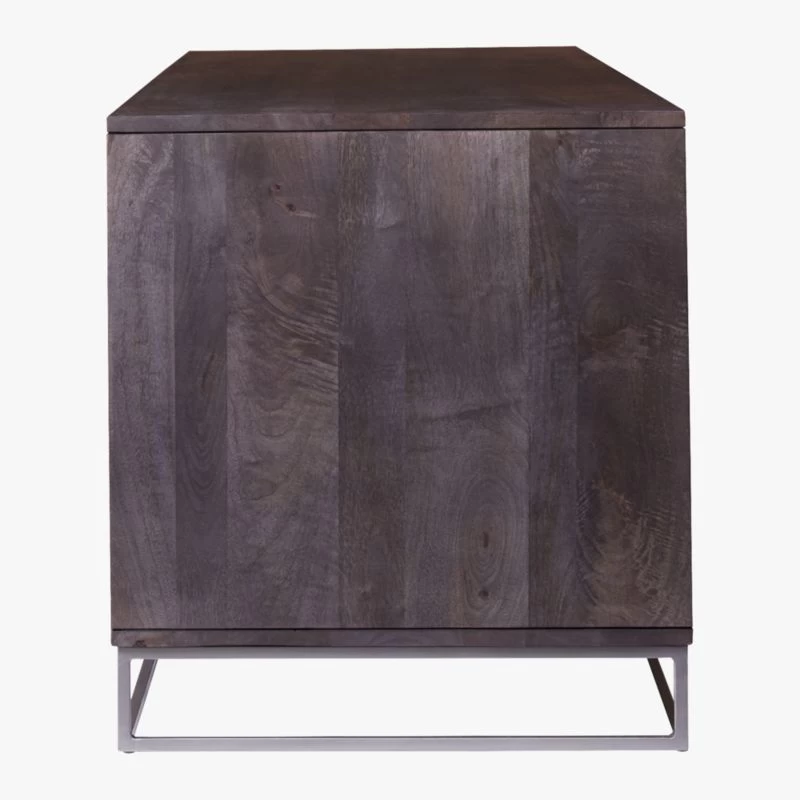 Multiple wood structure entertains with ease. Braced by a sleek iron base, dark mango wood frames natural teak active with beautiful light and dark wood grains. Two open component middle cubbies are flanked by drawers on the right and a door (with two shelves) on the left, leaving lots of room to store audio/video gadgets. Finish with a flat screen on top.