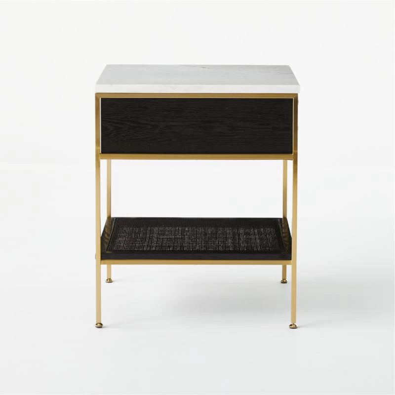 The slender lines, fine veneers and architectural detailing of Paul McCobb’s Connoisseur Group are just as elegant today as they were when first introduced in 1954. Beautifully crafted wood nightstand features oak, tornado marble top, natural cane shelf and brass-plated knob—thoughtful details and sculptural influences that are stunning in their simplicity. CB2 exclusive.