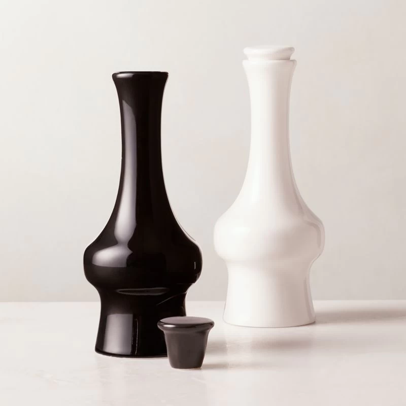 While staying authentic to their original 1959 silhouettes, our reissue of Paul McCobb’s Contempri Cruets gives them a dynamic update in new bone china with shiny black and white glazes. The pair features curvy, petite shapes with removable toppers—ideal for an oil and vinegar set. Mix in other colors and materials from the famed designer’s Contempri collection to create your own iconic assortment. Topper heights may vary slightly due to shrinkage in the new bone china. CB2 exclusive.