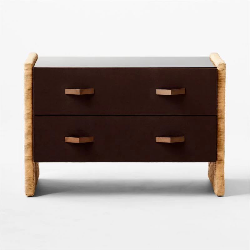 Inspired by Danish midcentury and ’70s modern, Kravitz Design nightstand exemplifies the sophistication of contrast. Paper cord sides, woven from a traditional Scandinavian material, and solid ash front provide an earthy contrast to luxe fabric-fronted drawers and bronze mirrored top. Wood handles stained dark walnut complete the picture. CB2 exclusive.