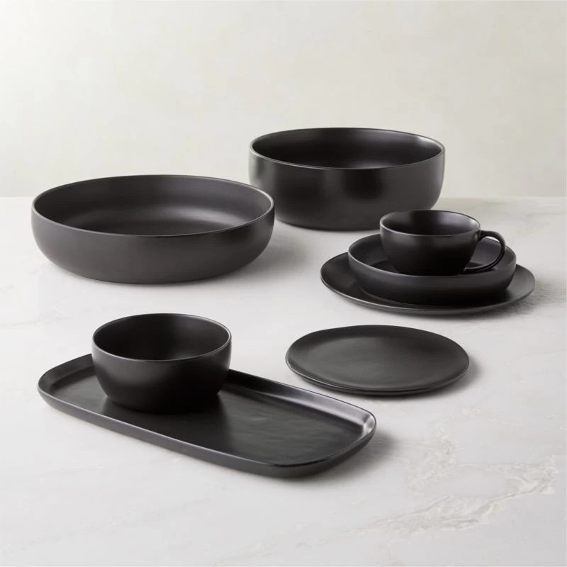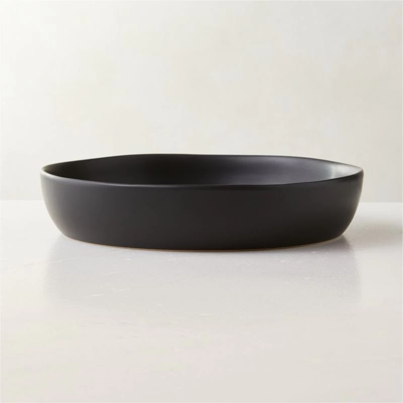 Handmade stoneware serving bowl with organic edges and a modern matte black glaze sets the table for everyday and special occasions alike. CB2 exclusive.
