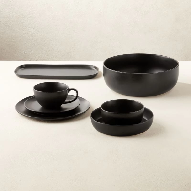 Handmade stoneware dinnerware with organic edges and a modern matte black glaze sets the table for everyday and special occasions alike. CB2 exclusive.