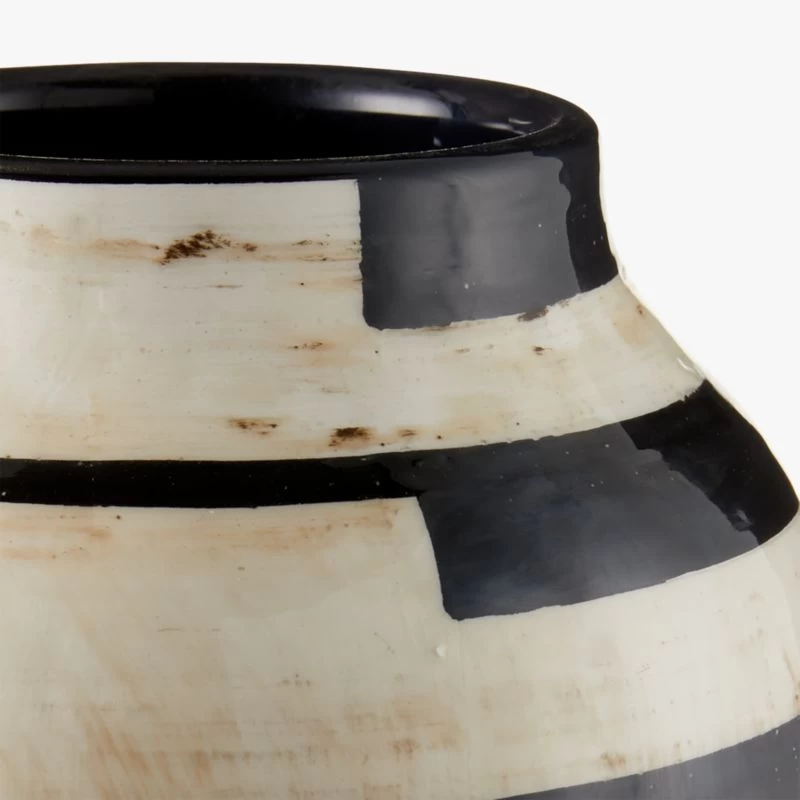 Handcrafted in a small Tuscan village where ceramics have been made since the 1400s, unique Italian artistry exudes old-world style for the modern home. Relying on traditional glaze and decoration practices, a network of artisans form each piece from raw clay and then use the “engobbio” technique to apply black glaze in organic stripes. After the vase is fired, specialists apply a penetrating light patina in brown tones to achieve an antiqued look. No two are exactly alike. CB2 exclusive.