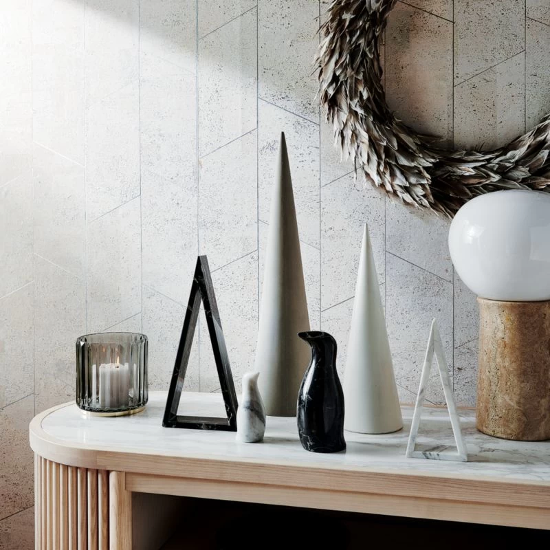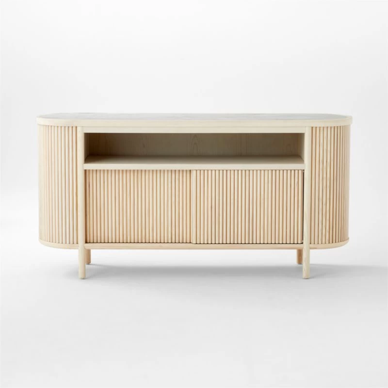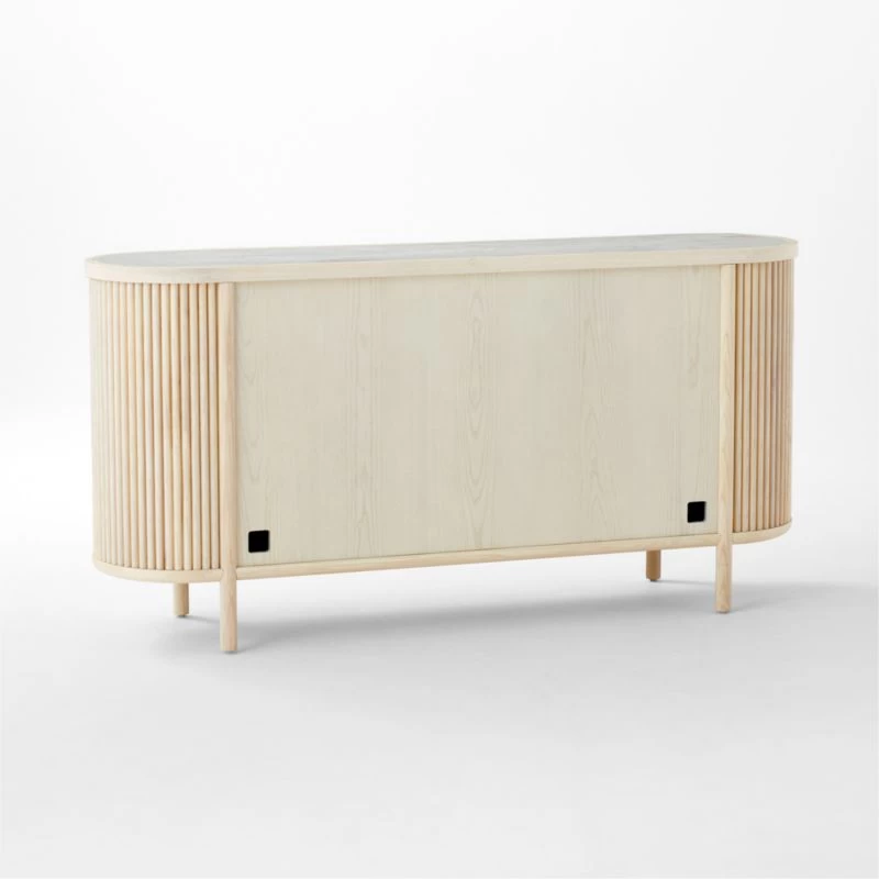 Stunning credenza features a volakas marble top and reeded wood detailing for added design edge. Uninterrupted by hardware, doors slide open to reveal adjustable shelves that offer versatile interior storage. Crafted from FSC ®-certified white washed ash wood, the piece works beautifully in the dining room, bedroom or entry. Because of its unique height, it also works fantastically as a bar or buffet. CB2 exclusive.