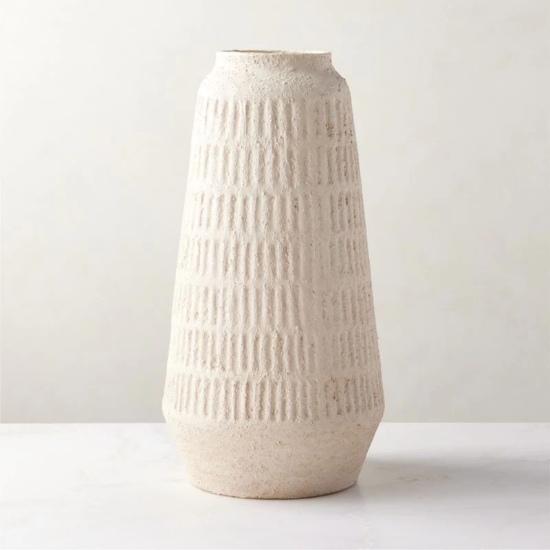 Crafted in Portugal, terra cotta vase features window-like indents throughout the tapered silhouette, adding to its rustic appeal. Bold in scale, the vessel is finished with a neutral matte glaze to highlight the heavily textured surface. An artisanal accent for showcasing greenery or dried botanicals. CB2 exclusive.