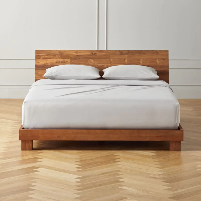 Eco platform sleeps sustainably sound with headboard of teak planks repurposed from homes no longer in use in India. Handplaned smooth, each plank patterns unique interest with its variegated tone, active grain, natural knots, splits and markings. Solid sustainable mango wood base is precision crafted with exposed peg joinery on low-profile block feet. Mattresses available, sold separately.