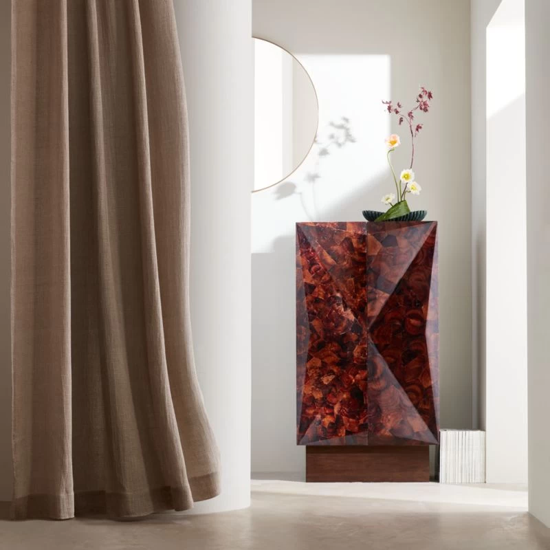 Pen shell bar cabinet from Melbourne-based VUUE is a natural showstopper due to its striking mix of materials. Crushed pen shells harvested from the Philippines are carefully pieced together by hand to form a natural mosaic that is counterbalanced by the warmth of an oak wood frame. The mosaic door fronts highlight the shells’ rich colors and unique markings, making each piece naturally one of a kind. Two sculpted push-to-open doors reveal a shelf for crafting cocktails and storage for bartending essentials. CB2 exclusive.