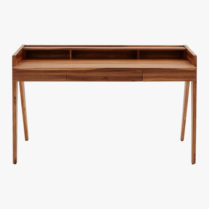 Sleek and architectural, wood desk designed by Jannis Ellenberger is a dream from every angle. With its warm tones and graceful grain, solid sustainable acacia wood offers a center drawer that flips down front for easy typing, as well as two side drawers and cord management. A natural complement to the Drommen bed and Standing Mirror. Learn about Jannis Ellenberger on our blog. CB2 exclusive.