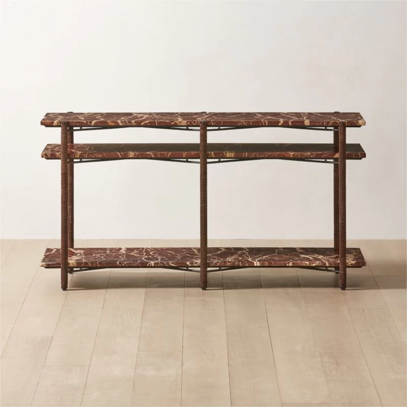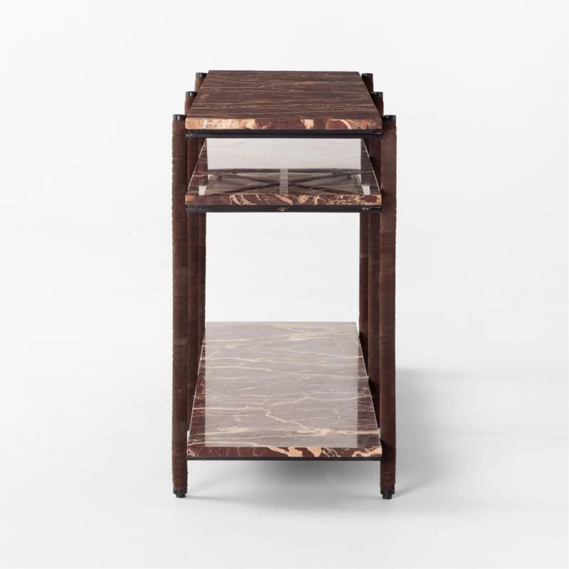 Console table by VUUE marries opulence with exacting craftsmanship. Shelves crafted from polished Rosso Levanto marble are awash in rich hues of brown, red and cream. A steel frame, lustrous in black powder coating, is wrapped in rich, chocolatey suede to create an indulgent and dramatic entryway moment. CB2 exclusive.