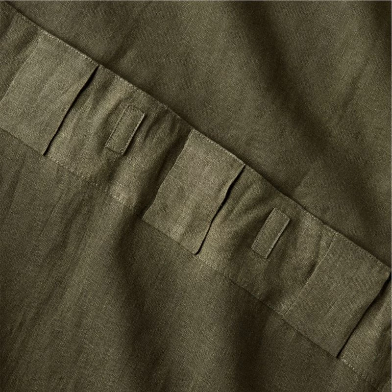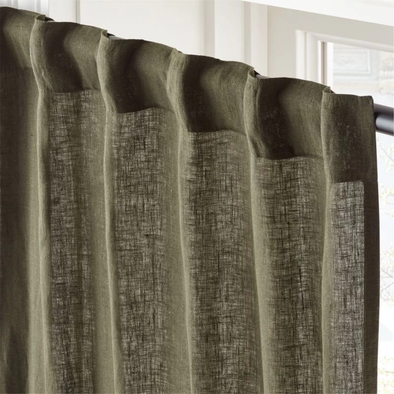 Light-filtering linen drapery is woven from natural flax grown in Europe. Full-length in forest green. Hangs beautifully with back tabs, rod pocket or drapery hooks. CB2 exclusive.