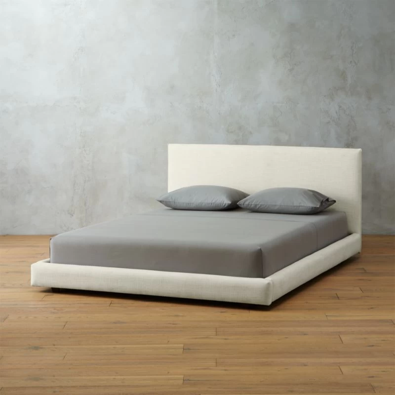 Clean box silhouette sleeps hi-fashion in soft white linen-y weave. Dreamy in hi/lo proportions: Slim cushioned headboard scales up for comfy reading in bed on low-profile frame. Tailored neat all the way around so it can float in the room. CB2 exclusive.