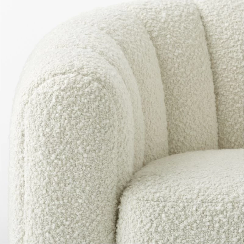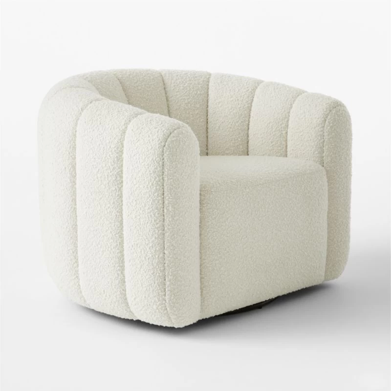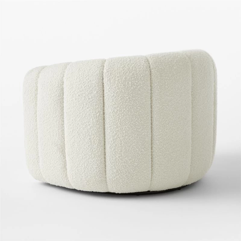Channel-tufted in rich white boucle, deco-inspired chair makes a vintage statement wherever it sits. Designed by VUUE and made with wood certified sustainable by the Forest Stewardship Council ®, swivel chair looks good from every angle. CB2 exclusive.