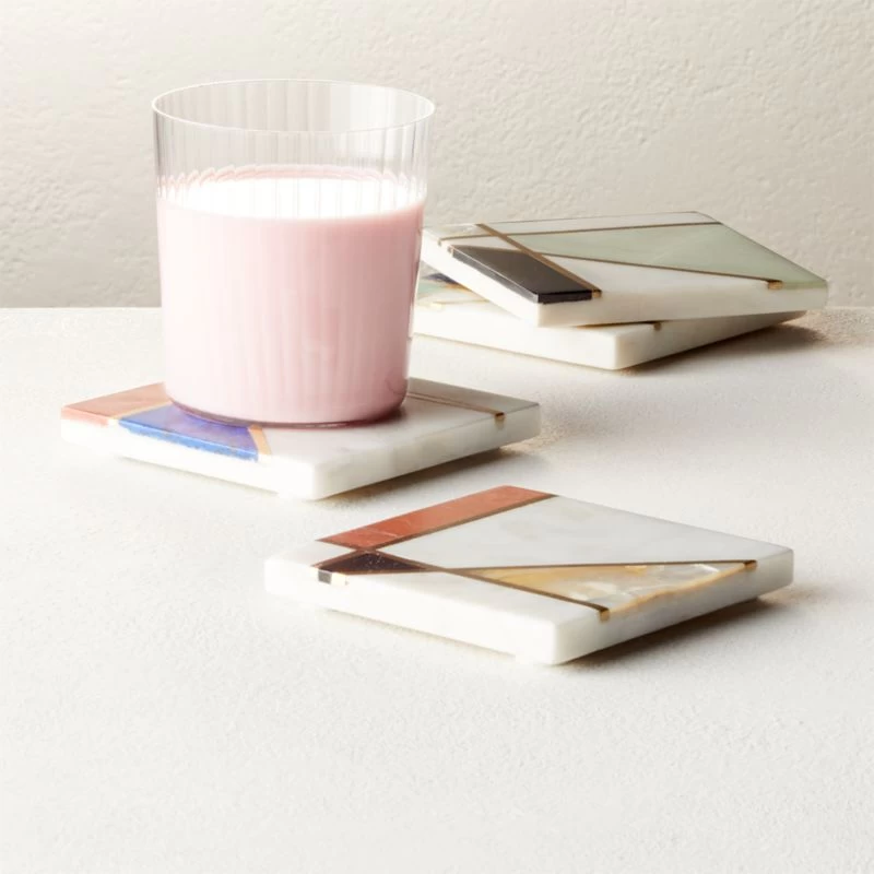 Our favorite materials all served up in a set of four. White marble and brass mix with precious stones of blue lapiz, pink stone, black kadappa, green pizer and mother of pearl for the most show-stopping coasters. Functional, but also a work of art. CB2 exclusive.