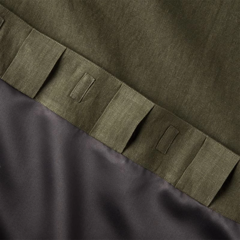 Blackout forest green linen is woven from natural flax grown in Europe. Opaque lining blocks out light with a clean hem on the seams for a tailored look. Hangs beautifully with back tabs, rod pocket or drapery hooks. CB2 exclusive.
