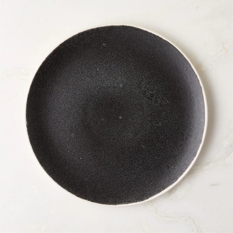 Black and white reactive glazes get graphic in stoneware that calls to mind galaxies and starscapes. Handmade dinner plate is trimmed, scraped and sponged, then fired and finished by hand with a rich glaze—one that varies beautifully from piece to piece. CB2 exclusive.