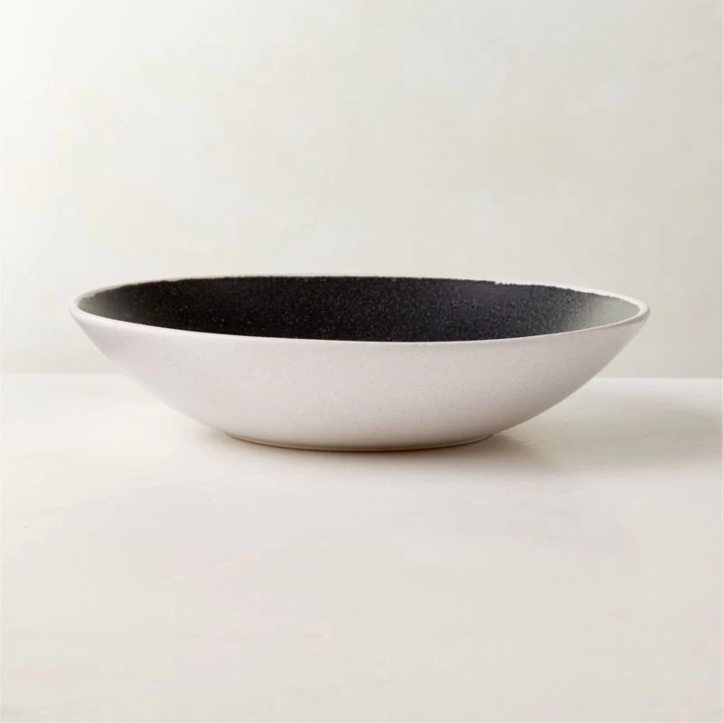 Black and white reactive glazes get graphic in stoneware that calls to mind galaxies and starscapes. Handmade pasta bowl is trimmed, scraped and sponged, then fired and finished by hand with a rich glaze—one that varies beautifully from piece to piece. CB2 exclusive.
