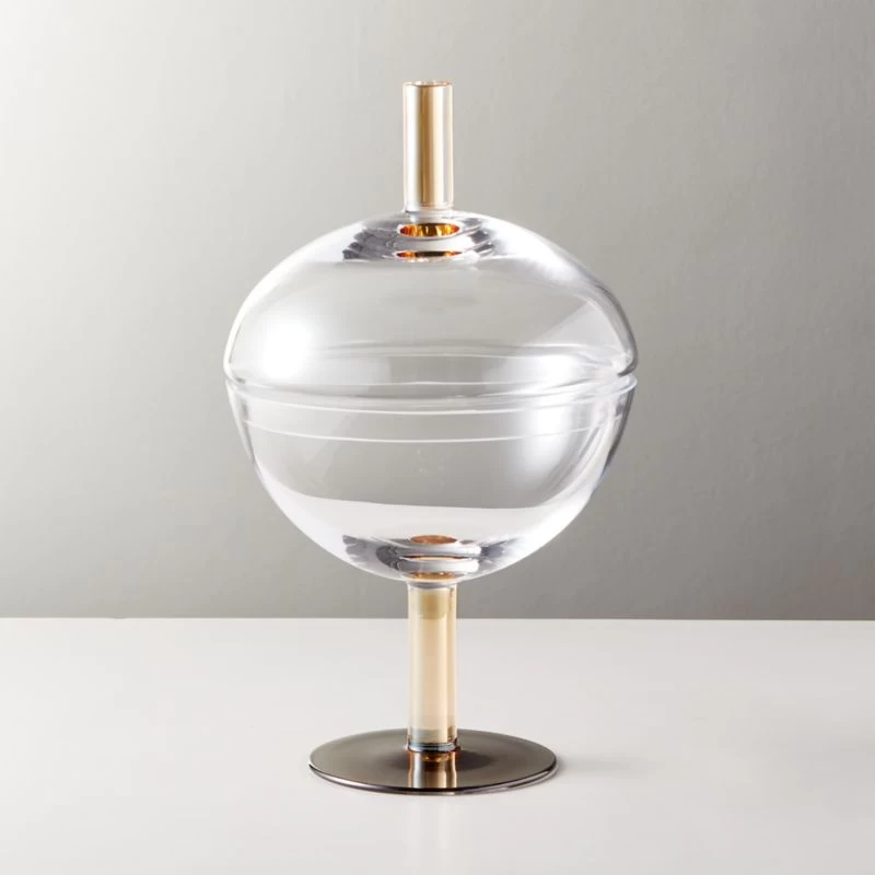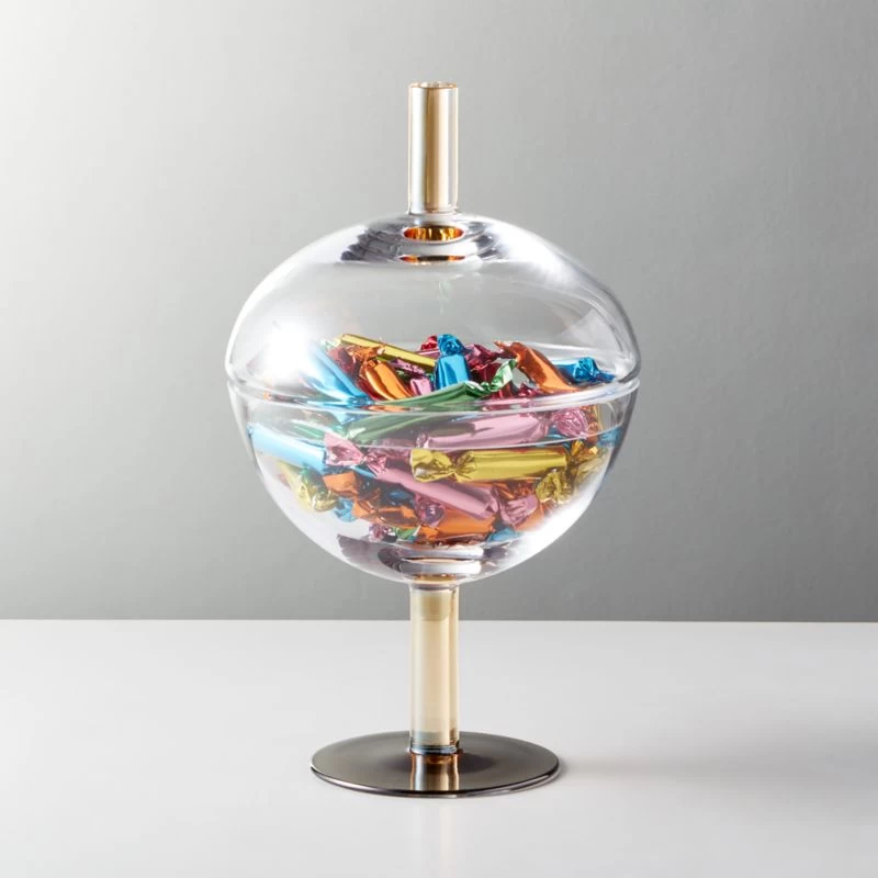 You probably didn’t even know you needed a candy dish—until now. Completely reimagined and impossibly chic, handblown sculpture offers sweets for the modern home. Delicate smoke-colored glass forms a roomy bowl and matching lid floating between sleek amber glass rods. Perfect for mints, gum, fruit, even ice for drinks