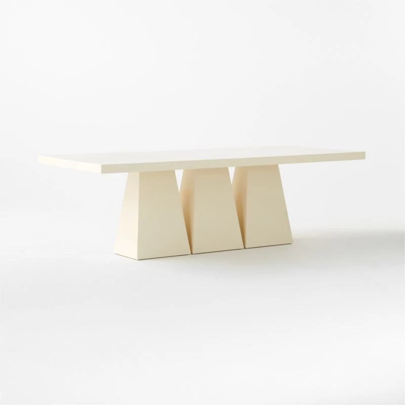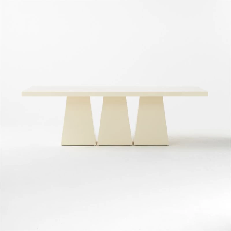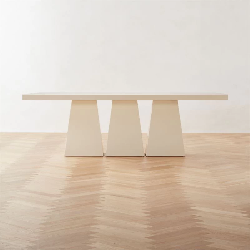 The dramatic anchor of any dining room, Studio Anansi’s oversized table advances a sophisticated design aesthetic that’s easy to live with. Three angular pedestal bases support a thick rectangular top that accommodates up to 10. Meticulously coated in a glossy lacquer, the off-white tone has just a touch of warmth to align with neutrals, pure black and light tones—everything, essentially. CB2 exclusive.