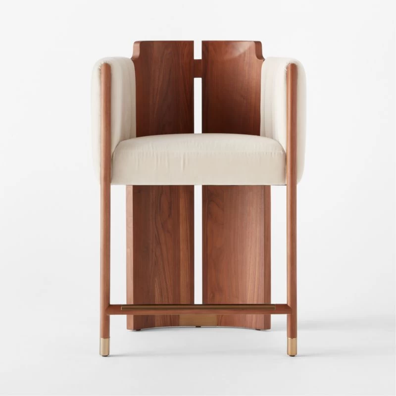 Crafted of FSC ®-certified solid black American walnut, Lawson-Fenning’s statement-making counter stool mixes materials for an elevated look. Channel-tufted cotton velvet upholstery and ornamental solid brass detailing are beguiling accents against the depth, length and richness of the wood. Daring, oversized silhouette has generous seating space—and is sure to be a conversation starter during cocktail hour. CB2 exclusive.