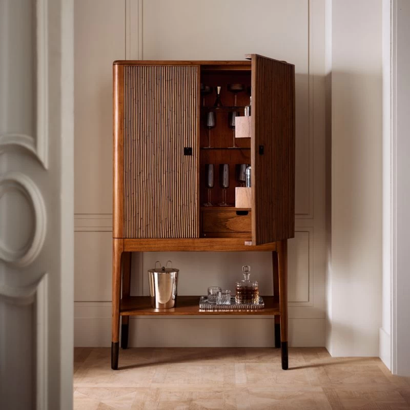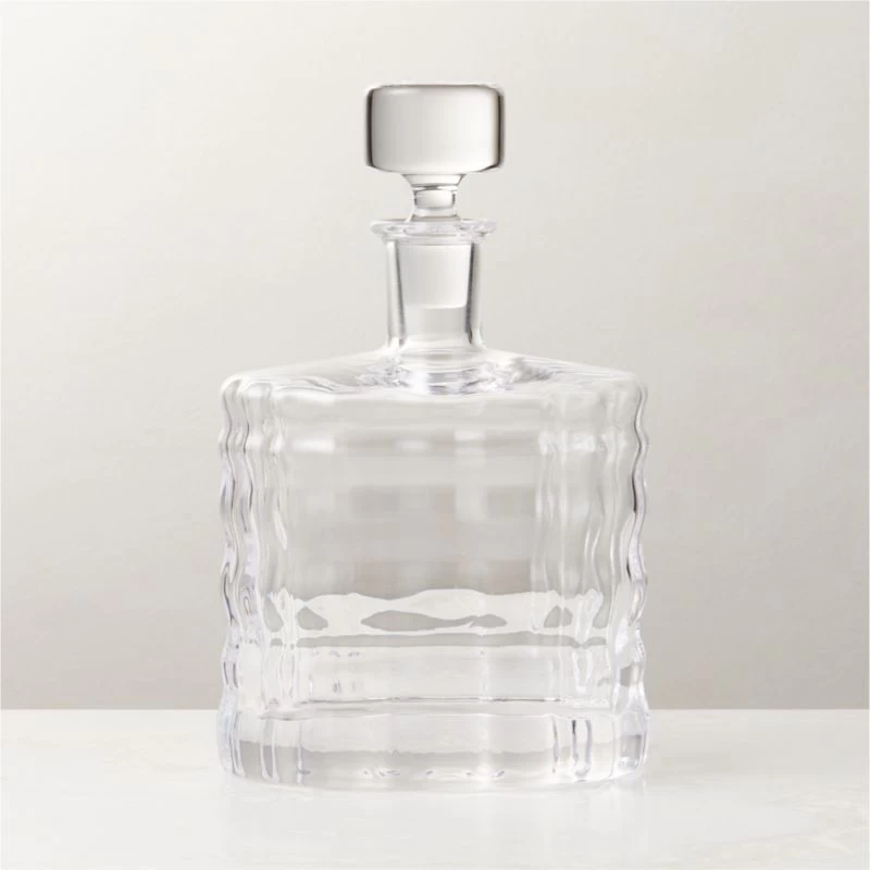 Handblown glass decanter showcases undulating waves across its surface—an effect entirely attributable to its handcrafted nature. Capped with an oversized glass stopper for extra drama on the bar. CB2 exclusive.