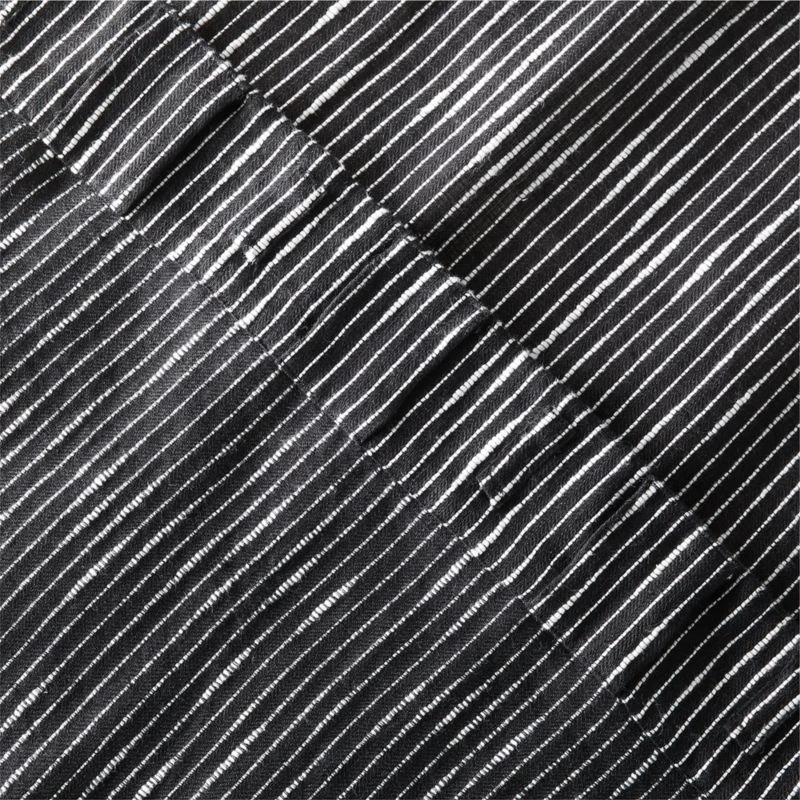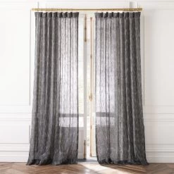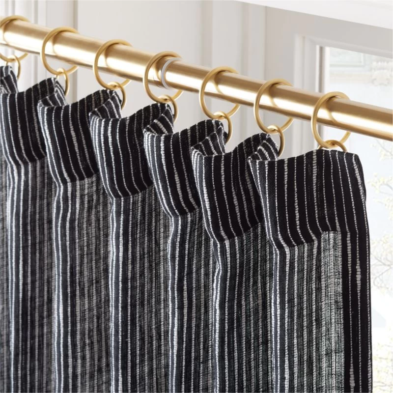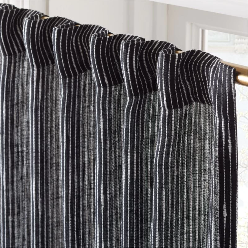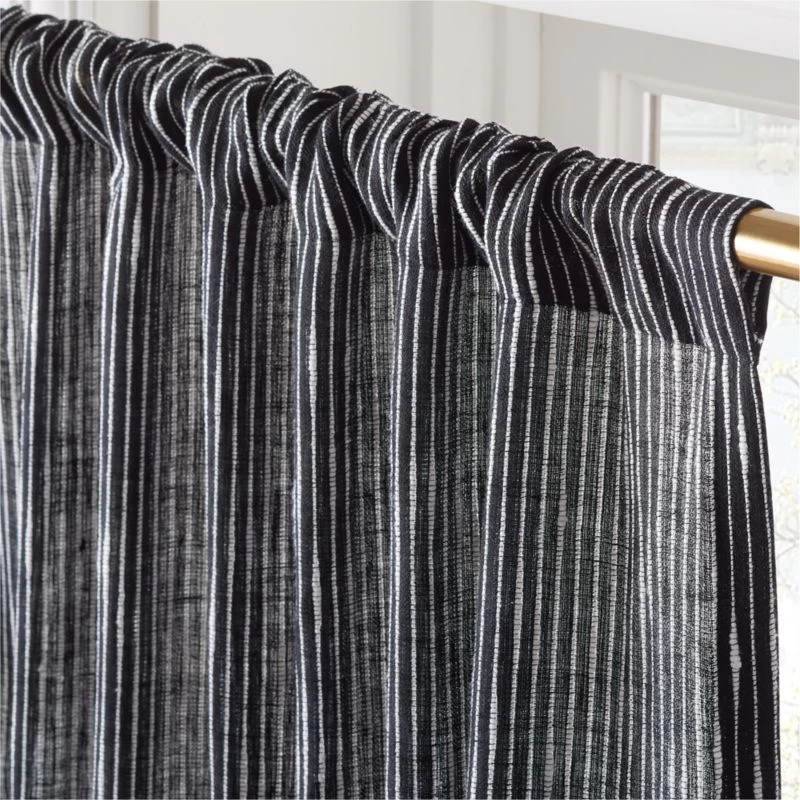 Woven linen/cotton blend curtain panel features soft black and white twisted stripes with effortless drape. Light-filtering weight allows just enough sunshine in while retaining privacy. Hangs beautifully from back tabs, rod pocket or drapery hooks. CB2 exclusive.