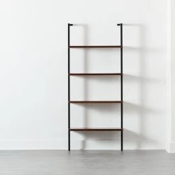 Fresh feels for a cult favorite. Rich walnut veneer shelves are fixed to powdercoated metal frames and stand stacked to heights of 70″. Space-saving modular design allows for dramatic repetition down the wall and plays nicely with our Helix walnut desk. Stud mounting recommended; hardware included for drywall installation. CB2 exclusive.