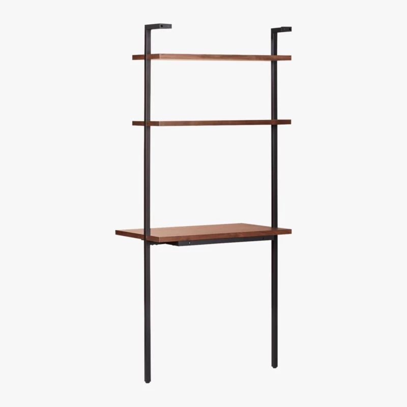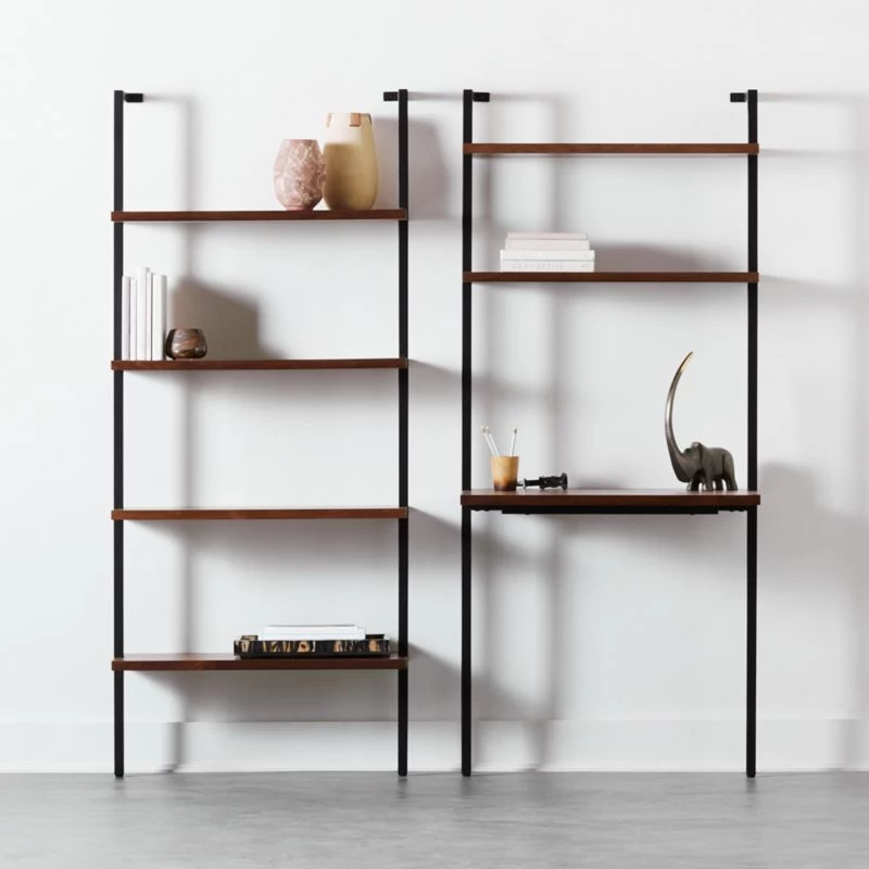 Party on top, business on the bottom. Three fixed walnut veneer shelves ladder up alongside a powdercoated metal frame and pull double duty as a display/work space. Modularly designed to save room and stand next to our matching Helix walnut bookcase. Stud mounting recommended; hardware included for drywall installation. CB2 exclusive.