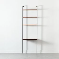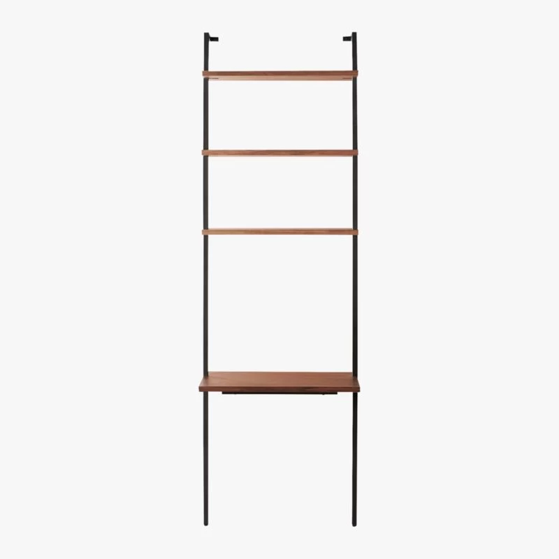 Party on top, business on the bottom. Three fixed walnut veneer shelves pan out in a powdercoated metal frame. Modularly designed to pull double duty as a display/work space and looks even better standing next to our Helix walnut bookcase. Stud mounting recommended; hardware included for drywall installation. CB2 exclusive.
