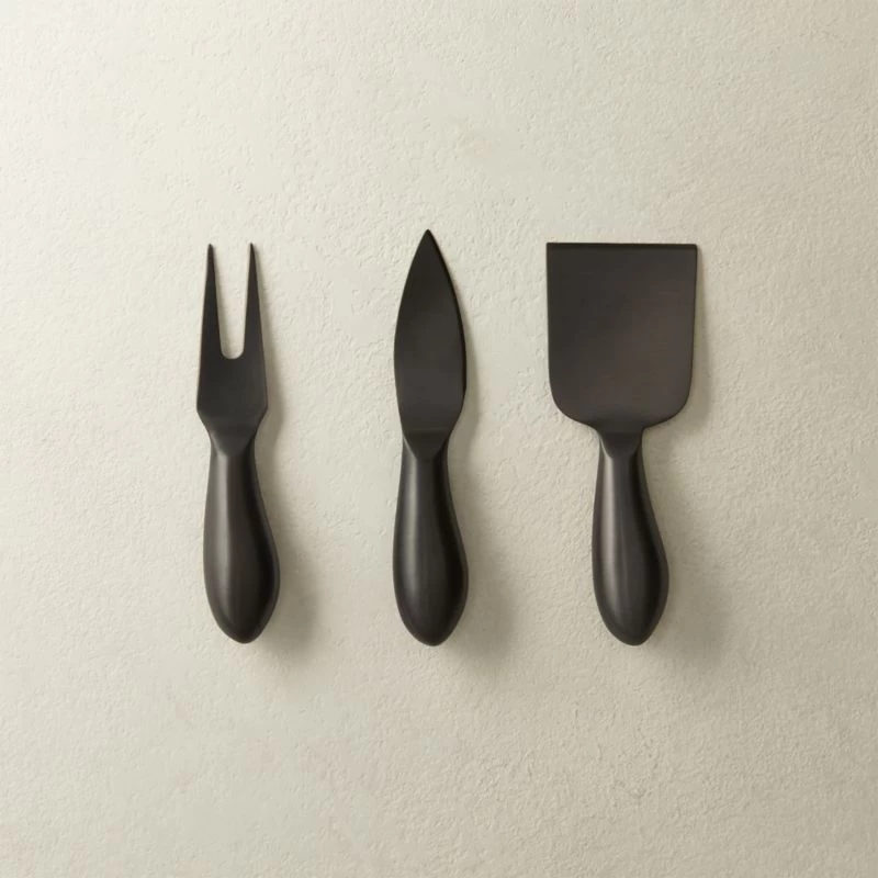 Small sculptural tools in sleek matte black add an edgy touch to the appetizer course. Trio of slicer, fork and knife make a great engagement, housewarming or host gift. CB2 exclusive.