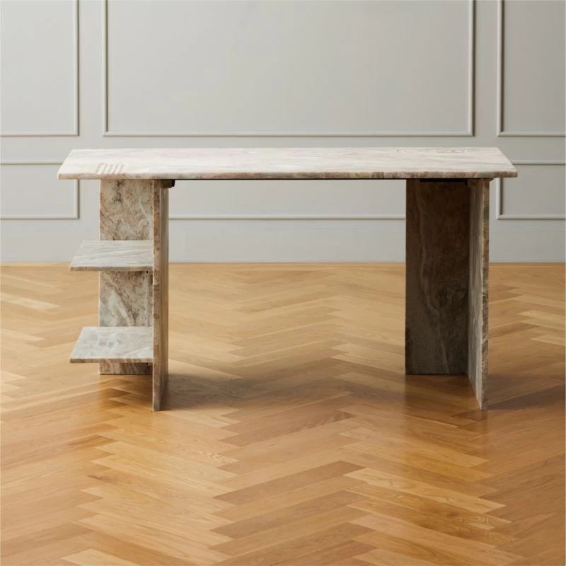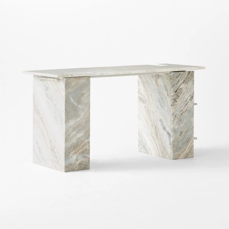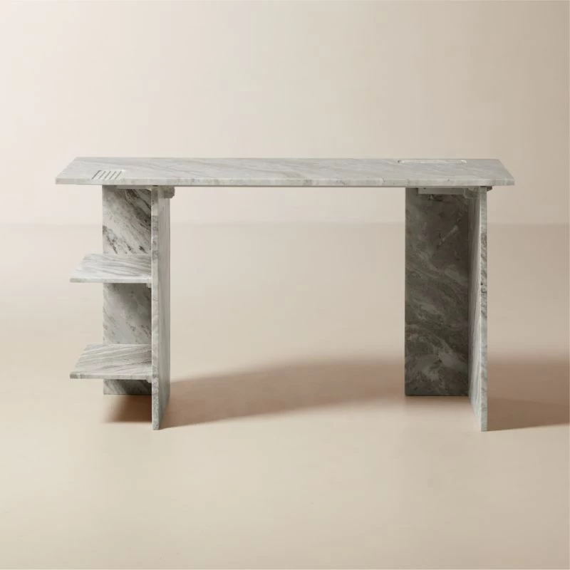 Minimalist silhouette puts stunning torrento marble on display. Details such as storage shelves and built-in pencil holder feel completely at home among the rich veining. Entire desk is polished to a subtle shine, bringing out tones of grey, white and pink. Marble color will vary vastly from desk to desk. Slab top features a light clear coat for an extra layer of protection. Can double as a bar or vanity. CB2 exclusive.