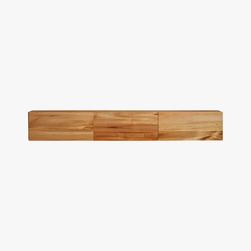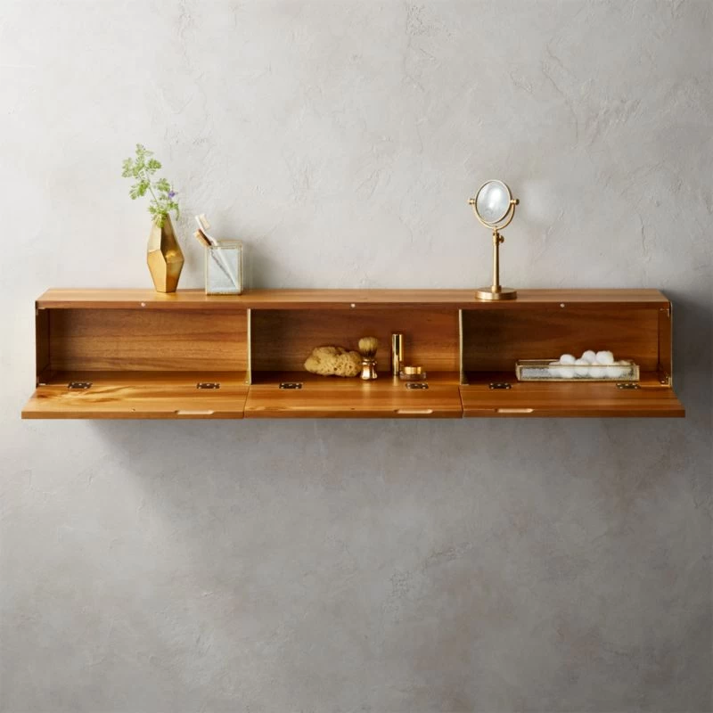 Warm acacia wood double doors flip to surprise brass walls inside this smart storage shelf by Diana Lu of Slate Design. Use solo, stacked or ganged down the wall. Great storage solution to free up floor space in dining, entry, hallway, bath or bedroom. Extra-long for added storage. Learn about Diana Lu of Slate Design on our blog. CB2 exclusive.
